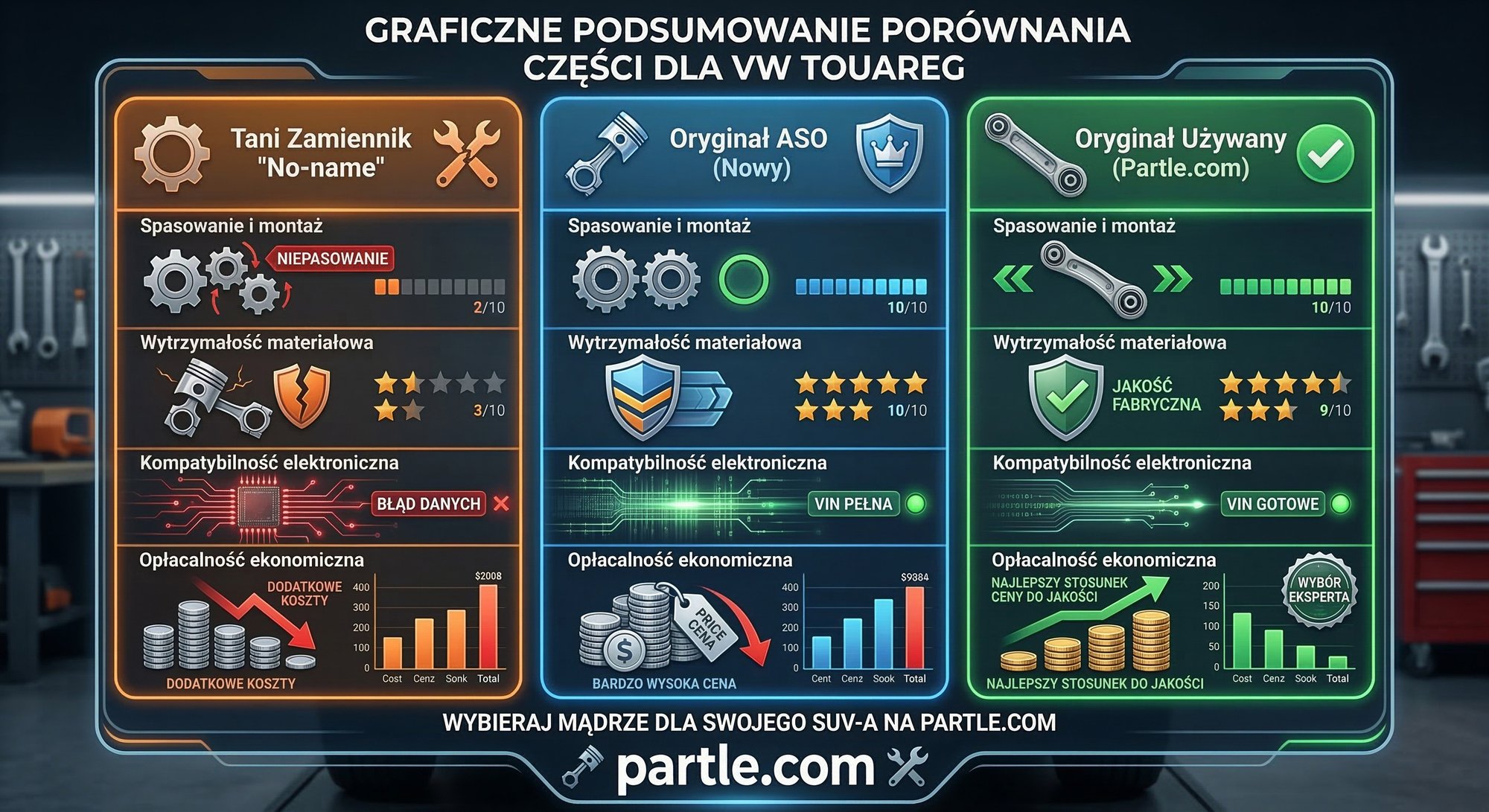 Jako praktyk analizujący rynki części dla Partle, jednoznacznie odradzam tanie zamienniki w autach tej klasy. Skomplikowane sterowniki czy reflektory LED z tanich źródeł często nie komunikują się poprawnie z magistralą CAN w Touaregu, wyrzucając błędy na desce rozdzielczej.